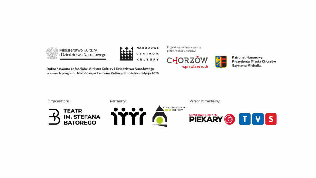 Projekt dofinansowano ze środków Ministra Kultury i Dziedzictwa Narodowego w ramach programu Narodowego Centrum Kultury EtnoPolska. Edycja 2025 i Miasta Chorzów.